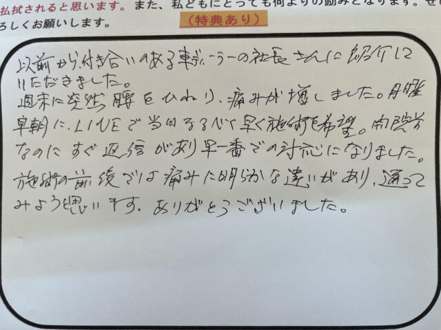 施術の前後では痛みに明らかな違いがあり、通ってみようと思います。ありがとうございました。