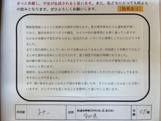 首や肩甲骨あたりに違和感「頸椎椎間板ヘルニア」 春日井市在住 女性
