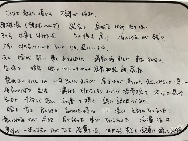 その後も肩こり、指のしびれが残り、上手く付き合っていくしかないと日々過ごしている中、元々、腰が弱い事もありましたが通勤時間が車で90分の生活で昨年腰のヘルニアから座骨神経痛発症。